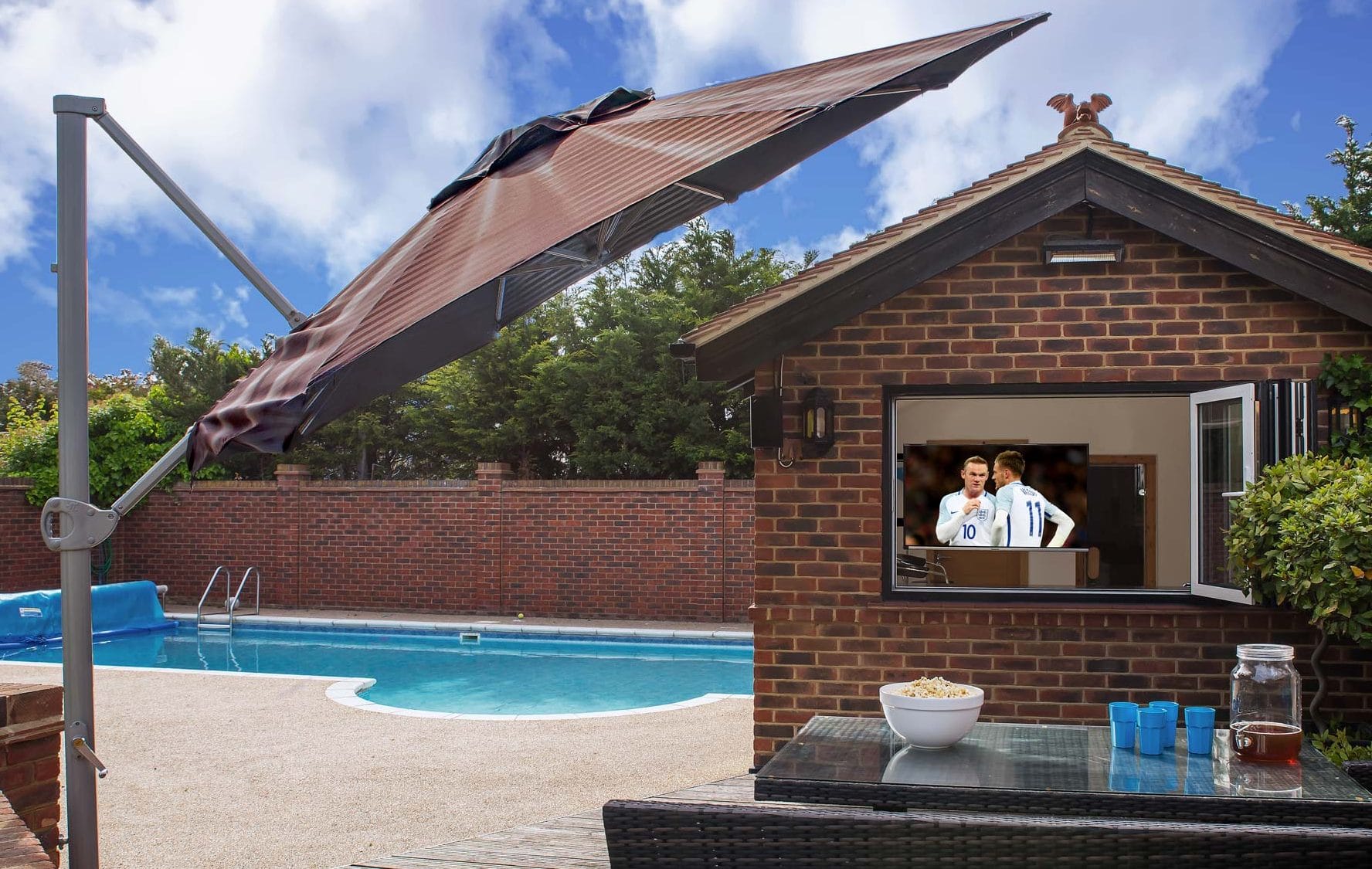 Our clients wanted to enhance their outdoor living space by installing a television that could be enjoyed from both inside the pool house, and outside on the sun loungers. In addition, we were asked to recommend and install speakers that could withstand the unpredictable British summers whilst still providing excellent sound quality. The idea behind the project was to create an extra layer of luxury for this already special space, allowing the clients to spend summer evenings outdoors listening to music, catching up on films or inviting friends round to watch the football.